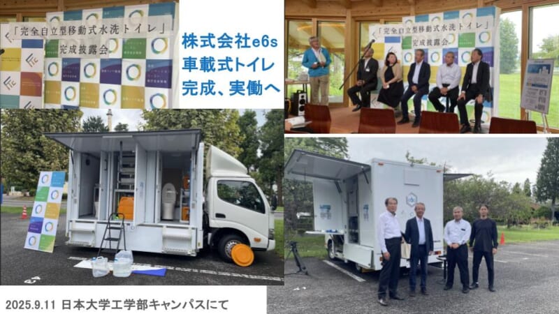 Along with lifelines that should not be stopped in a disaster, what should not be stopped is dignity. e6s Corporation, which also participates in the RIVANES resilience project, recycles toilet flushing water and reduces and recovers waste in a hygienic manner.Fully freestanding flush toiletsindicates object of desire, like, hate, etc.Implemented in one vehicle.Independent of external water supply, sewage or commercial power,Arrival = operation, removal = immediate moveOn September 11, 2025, we unveiled the actual "Running Sanitation Infrastructure" that will realize the "Resilience Project". The Resilience Project is a project to provide the machine to disaster-affected areas, evacuation centers, and temporary shelters.Reliable reachable sanitationWe will promote social implementation as